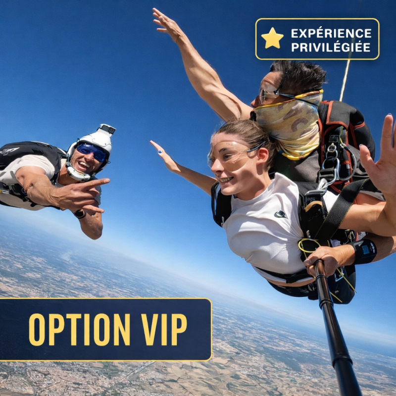 Pour ceux qui souhaitent immortaliser leur saut en parachute tandem de manière exceptionnelle, notre option vidéo VIP est faite pour vous. Cette formule exclusive vous permet de bénéficier du double d'images par rapport aux formules classiques.